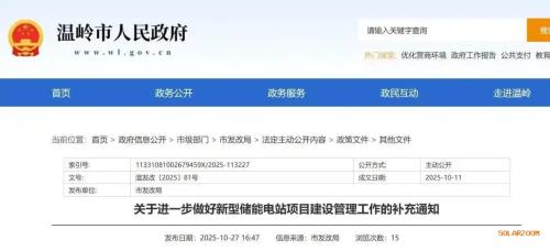 10月27日,浙江温岭市人民政府发布《关于进一步做好新型储能电站项目建设管理工作的补充通知》。通知明确功率500KW(含500KW)以上且容量500KWh(含500KWh)以上的电化学储能项目实行消防备案抽查制度。