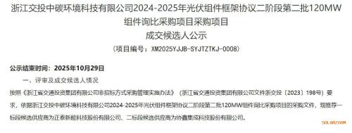 10月28日,浙江交投中碳环境科技有限公司2024-2025年光伏组件框架协议二阶段第二批120MW组件询比采购项目采购项目成交候选人公示。