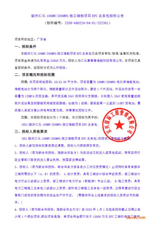 10月29日,仁化康普盾储能科技有限公司发布韶关仁化100MW/200MWh独立储能项目EPC总承包招标公告。项目位于广东韶关,项目建设100MW/200Mh电化学储能电站。项目资金来源为私有资金22000万元,折合单价1.1元/Wh。