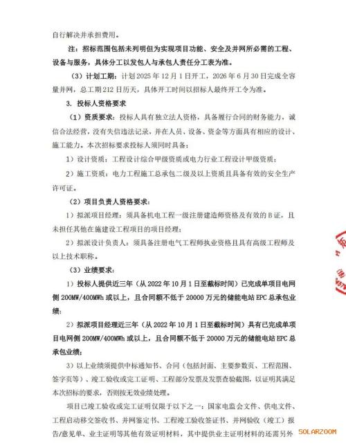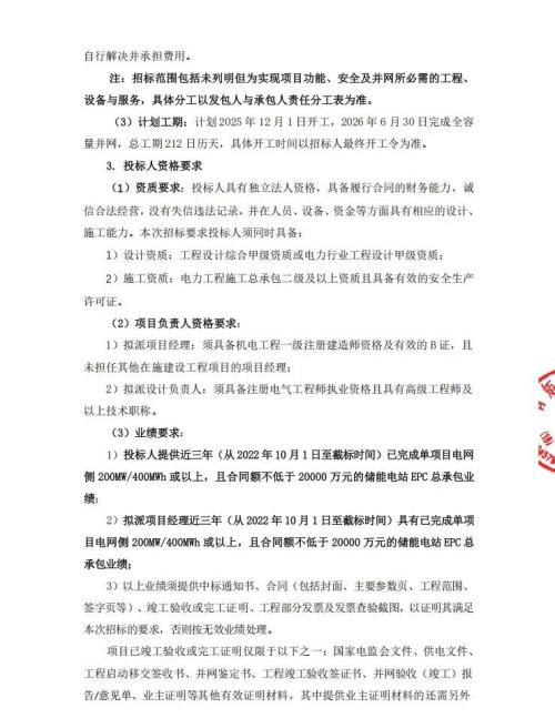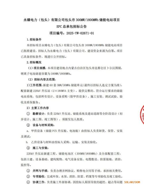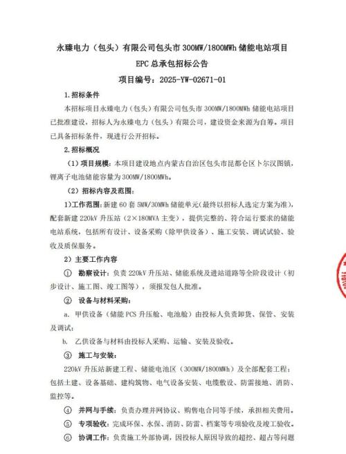 招标条件:本招标项目永臻电力(包头)有限公司包头市300MW/1800MWh储能电站项目已批准建设,招标人为永臻电力(包头)有限公司,建设资金来源为自筹。项目已具备招标条件,现进行公开招标。