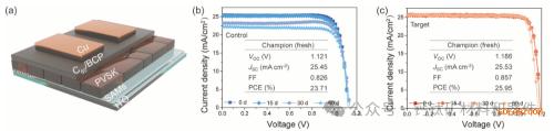 当TFPH掺入钙钛矿前驱体溶液中时,无论老化时间如何,所得PSCs始终提供约26.0%的功率转换效率。更值得注意的是,这些器件表现出卓越的运行稳定性,在ISOS-L-3协议下连续运行1830小时后仍保持超过92%的初始效率。