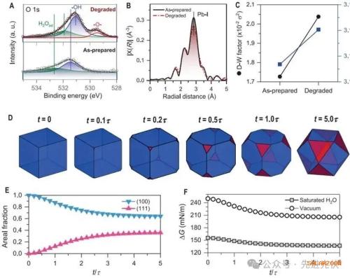 图3通过X射线光电子能谱和扩展X射线吸收精细结构等表征手段,从分子和原子层面揭示了晶面依赖性降解的内在机制。A部分的O 1s XPS谱显示降解后样品在532.7 eV和531.5 eV处的H2O吸附和-OH物种峰强显著增加,且结合能分别向低能方向移动0.8 eV和0.4 eV,表明水分子与钙钛矿表面相互作用增强;B和C部分的EXAFS分析发现降解样品的Pb-I键距从3.135 Å延长至3.150 Å,且德拜-沃勒因子增大,说明水分子的吸附导致PbI6八面体结构畸变和键合弱化;D至F部分的理论计算模型表明(100)面具有更高的水吸附能(93.08 mN/m),其界面能驱动晶体形态向热力学更稳定的(111)面演化,吉布斯自由能随时间持续降低,这从动力学和热力学角度合理解释了(100)面为何更容易发生水分诱导的δ相变。