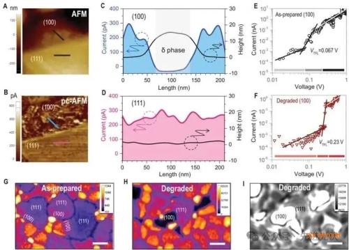 图2结合光电流原子力显微镜和共聚焦光致发光mapping技术,深入揭示了降解后(100)和(111)晶面的光电性能异质性。A和B部分的pc-AFM图像显示降解72小时的样品中(111)面保持光滑表面和均匀光电流,而(100)面则出现电流波动剧烈的区域,C和D部分的线扫描剖面进一步证实(100)面上的δ相区域比未降解部分高出约15纳米且光电流几乎为零,相反(111)面在高度和光电流方面均无显著变化;E和F部分通过AFM尖端作为电极测量的电流-电压曲线表明降解后的(100)面导电性显著恶化,G至I部分的共聚焦PL和透射mapping则显示降解后(100)面出现PL淬灭的暗区,对应透射图像中的亮区,这些结果一致表明水分诱导产生的δ相主要形成于(100)面,并严重损害其光电性能