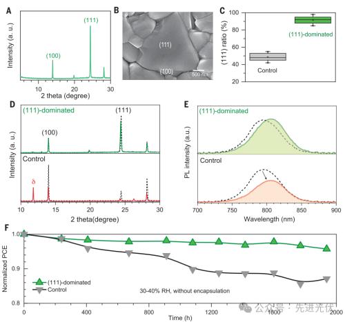 图4展示了通过晶面工程策略制备(111)面主导的钙钛矿薄膜,并验证其显著增强的稳定性。A和B部分的XRD图谱和SEM图像显示,使用环己胺添加剂后薄膜呈现主导的(111)相和大型三角形形貌,C部分的统计计算表明(111)面占比从对照样的40-55%提升至85-98%;D和E部分的XRD和PL光谱表明,在30-40%湿度下暴露1000小时后,(111)主导的薄膜其(100)和(111)峰强度仅轻微降低,而对照样品的(100)峰强度降至初始值的30%且出现明显δ相峰;F部分的器件稳定性测试显示,未封装的(111)主导器件在约2000小时后仍保持95%的初始效率,显著优于对照器件的87%,且在85°C/85%RH的严苛条件下也表现出更好的稳定性,这证明通过扩大稳定的(111)晶面比例可有效提升钙钛矿太阳能器件的环境耐受性。
