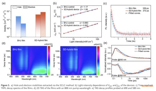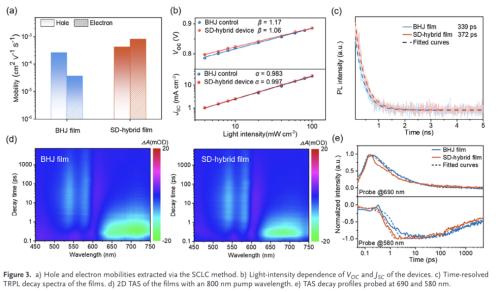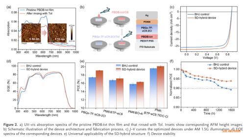 多功能中间层协同增效:PBDB-tvt中间层不仅优化了垂直相分布,还增强了短波长光吸收,提升电荷传输与提取效率,抑制复合。