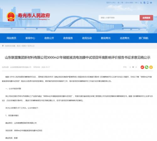 《山东联盟集团新材料有限公司3000㎡/年储能液流电池膜中试项目环境影响报告书征求意见稿》全文网络链接为: