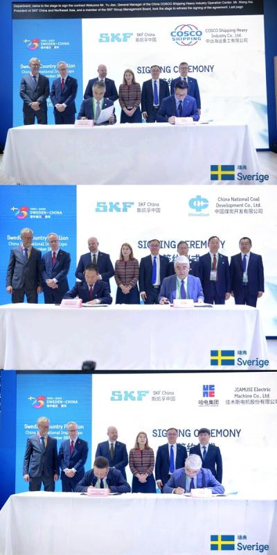 自1912年进入中国以来,斯凯孚的百年发展与中国工业脉络紧密交织,为工业、铁路等40多个行业的发展与升级提供了坚实支撑。在与中国伙伴合作的历程中,推动着彼此的成长。本次进博会上,在瑞典乡村事务部大臣彼得•库尔格伦、瑞典驻华大使欧思诚、总领事韩安妮和瑞典贸易与投资委员会首席执行官杨.拉尔森的见证下,斯凯孚与中远海运重工有限公司、中国煤炭开发有限责任公司、佳木斯电机股份有限公司分别签署合作协议。