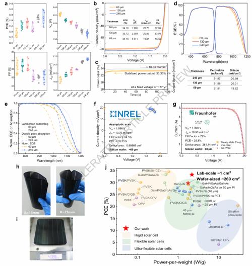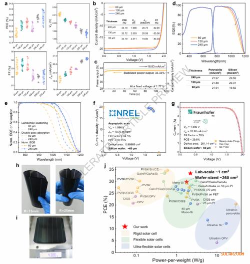 在1 cm²和260 cm²面积上分别实现33.4%和29.8%的认证效率,同时单位重量功率高达1.77 W/g,远超传统柔性光伏器件。