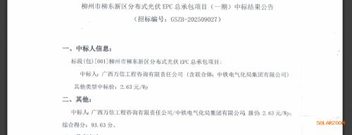 其中,中标人为广西万信工程咨询有限责任公司(含联合体:中铁电气化局集团有限公司),其他类型中标价:2.63元/W。