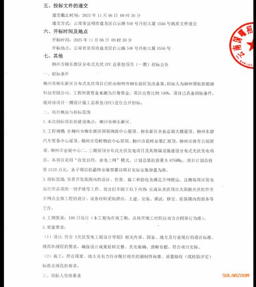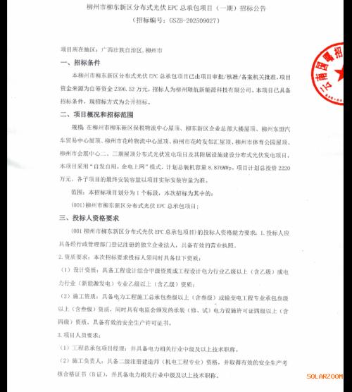 近日,柳州市柳东新区分布式光伏EPC总承包项目(一期)分布式光伏项目EPC总承包中标结果公示,其中: