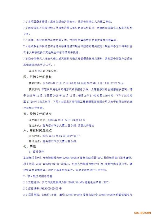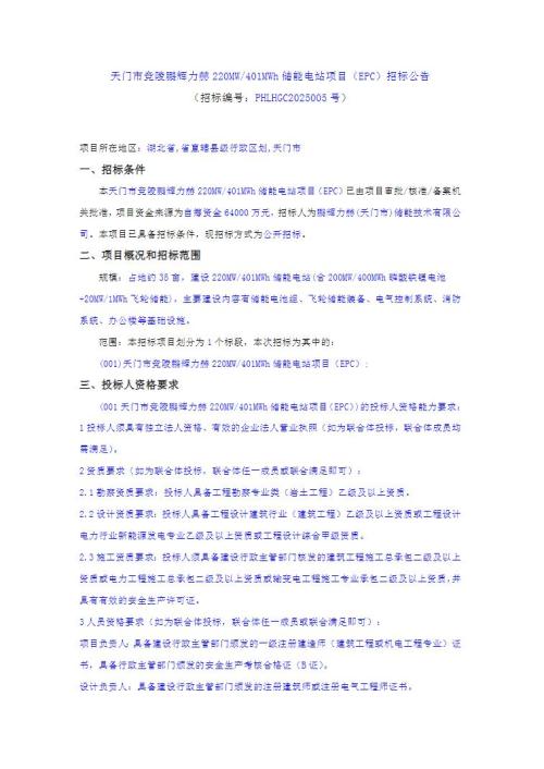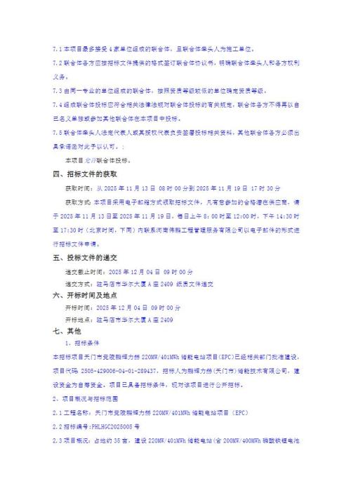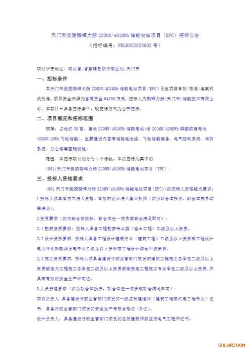 11月12日,天门市竞陵鹏辉力赫220MW/401MWh储能电站项目(EPC)招标公告发布。
