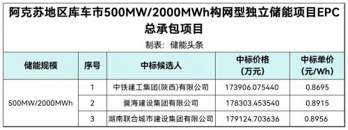 第一中标候选人为中铁建工集团(陕西)有限公司,投标报价为173906.08万元,折合单价为0.8695元/Wh;第二中标候选人为誉海建设集团有限公司,投标报价为178303.45万元,折合单价为0.8915元/Wh;第三中标候选人为湖南联合城市建设集团有限公司,投标报价为179124.7万元,折合单价为0.8956元/Wh。