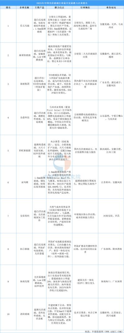 2025年中国光伏玻璃行业最具发展潜力企业主要包括信义光能、福莱特玻璃、南玻集团、金晶科技(6.510,-0.01,-0.15%)、彩虹新能源、亚玛顿(19.820,-0.35,-1.74%)、安彩高科(5.880,-0.11,-1.84%)、拓日新能(4.550,-0.51,-10.08%)、海南发展(15.730,0.06,0.38%)、洛阳玻璃。这些企业凭借产能扩张、技术突破和全球化布局占据行业主导地位。信义光能和福莱特稳居全球前二,重点布局超薄玻璃、双玻组件及BIPV等高附加值产品;彩虹新能源、南玻集团等依托央企背景或区域资源,聚焦大尺寸、高铝玻璃等细分领域。