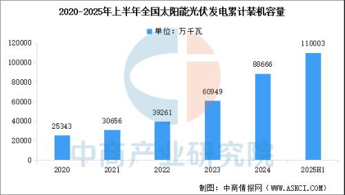 中商产业研究院发布的《2025-2030年太阳能光伏行业市场调研及投资前景预测报告》显示,截至2024年12月,全国光伏发电装机容量达到8.87亿千瓦,同比增长45%。截至2025年6月底,全国光伏发电累计装机容量达到约11亿千瓦,同比增长54.1%。