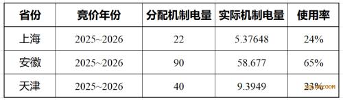 最近完成机制电价竞价的三个省份,安徽、上海、天津,机制电量都未用完,如下表所示。