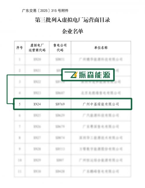 2025年11月27日,广东电力交易中心正式公布:振森能源全资子公司—广州中基绿能有限公司获批广东省第三批虚拟电厂运营商,成为佛山首家虚拟电厂运营商。