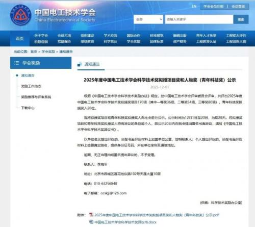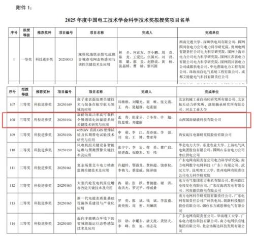 据全球液流电池网获悉,12月1日,2025年度中国电工技术学会科学技术奖拟授奖项目正式公示,山西国润储能科技有限公司自主研发的“高能效高功率高可靠性全钒液流电池储能系统关键技术研究与应用”项目,荣获2025年度中国电工技术学会科学技术奖三等奖。该奖项的获得,标志着国润储能在全钒液流电池储能领域的技术创新能力与产业化成果获得国家级行业学会的权威认可。