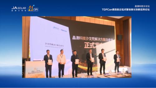 论坛期间,在国家部委、央国企设计院、权威科研机构以及产业链各环节的专家学者的共同见证下,晶澳科技隆重举行了全球首份《沙戈荒解决方案白皮书》的发布仪式。这份具有里程碑意义的白皮书由晶澳科技与国际权威认证机构TÜV北德联合编制,是双方优势互补的智慧结晶。晶澳科技深度融合了多年来在沙戈荒项目中积累的丰富经验与对客户痛点的深刻洞察,TÜV北德则充分发挥了在测试认证领域的专业优势,通过全面研究沙戈荒特殊的地理气候条件,最终共同形成了一套科学、严谨的测试与评估标准,以及专业解决方案。