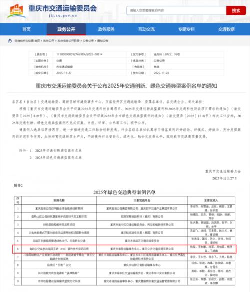 近日,公司实施的重庆公交光储充一体化项目,凭借创新性的节能实践与显著成效,从众多申报项目中脱颖而出,成功入选交通运输部“讲好交通节能故事”第一批典型案例,成为全国12个典型案例之一;电动公交车参与电网互动(V2G)调控技术示范应用更成为重庆市2025年绿色交通典型案例,实现了荣誉双收,成为全国交通运输绿色低碳发展的实践范本。