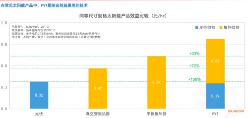 一项测试对比更加明显,同样气象条件、集热条件,以及能源价格情况下,同等尺寸规格太阳能产品效益中,PVT的发电效益为0.29元/hr,集热效益为0.52元/hr。
