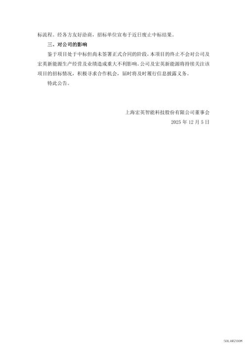 宏英新能源表示,本项目的终止不会对公司生产经营及业绩造成重大不利影响。公司及宏英新能源将持续关注该项目的招标情况,积极寻求合作机会。