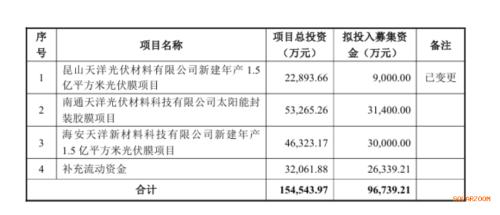 此次终止的两大胶膜项目投资进展各不相同。“南通天洋光伏材料科技有限公司太阳能(4.520. 0.01. 0.22%)封装胶膜项目”投资进度已达79.38%,已完成建筑面积88.260.89平方米的厂房建设,完成25条光伏封装胶膜产线设备投入。