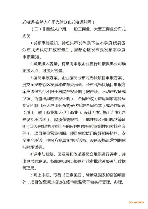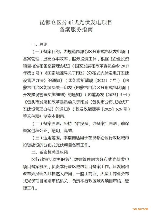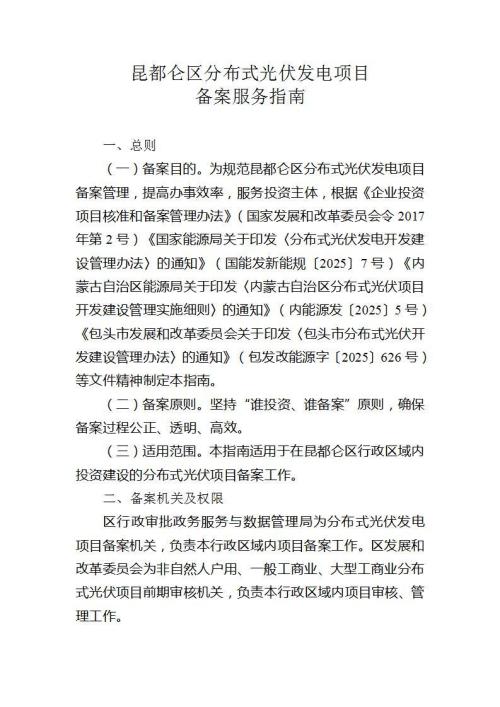 根据《企业投资项目核准和备案管理办法》(国家发展和改革委员会令2017年第2号)《国家能源局关于印发〈分布式光伏发电开发建设管理办法〉的通知》(国能发新能规〔2025〕7号)《内蒙古自治区能源局关于印发〈内蒙古自治区分布式光伏项目开发建设管理实施细则〉的通知》(内能源发〔2025〕5号)《包头市发展和改革委员会关于印发〈包头市分布式光伏开发建设管理办法〉的通知》(包发改能源字〔2025〕626号)有关文件要求,为加快推进昆都仑区分布式光伏项目建设,昆都仑区发展和改革委员会就分布式光伏项目开展审查工作。