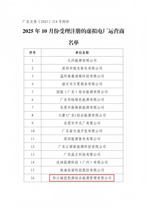 阳江市级虚拟电厂作为面向全市分布式能源、用户侧储能、工商业和公共机构的电力调节能力聚合平台,是践行国家双碳战略,构建阳江市新型电力系统建设的重要成果,是促进阳江市绿能之都建设的关键路径。在阳江市委市政府和广东省电力交易中心、南网广东公司负荷管理中心的指导和支持下,阳江市级虚拟电厂的投资主体——阳江城投凯源管理有限公司取得广东电力交易中心虚拟电厂运营商注册受理公示。
