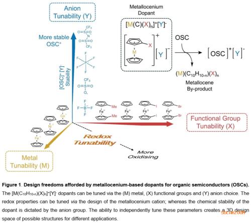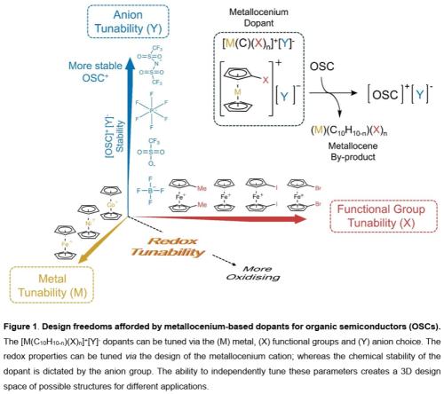 “可调控”掺杂剂设计新策略提出基于金属茂盐([M(Cp)₂]⁺[Y]⁻)的掺杂剂平台,可独立调控阳离子(通过改变金属中心M或环上官能团X)以精确匹配OSC的氧化电位,同时调控阴离子(Y)以优化掺杂效能与稳定性,为有机半导体掺杂提供了高度灵活的设计空间。