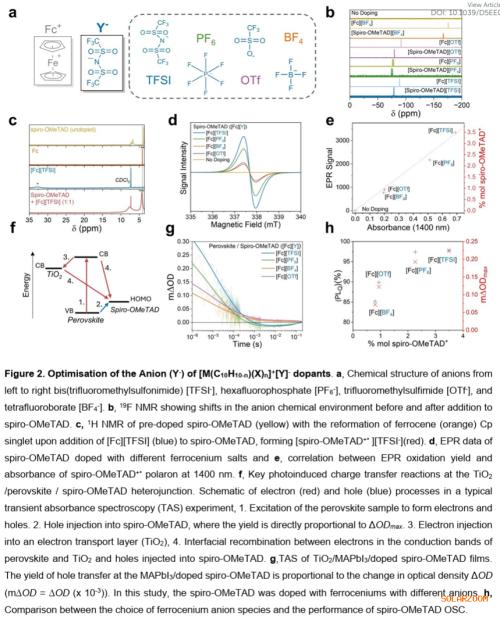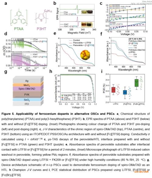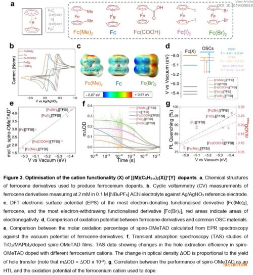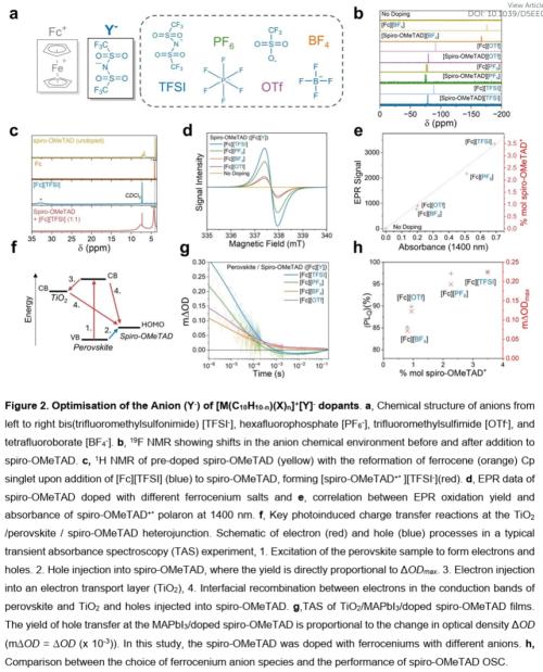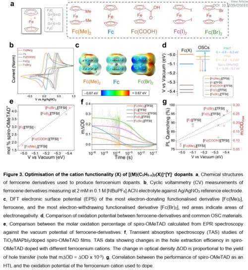 本文香港城市大学朱宗龙和伦敦帝国理工学院Saif A. Haque等人介绍了一类基于金属茂盐的通式化p型掺杂剂([M(C₁₀H₁₀₋ₙ)(X)ₙ]⁺[Y]⁻),能够满足上述要求。该方法的关键在于能够通过氧化还原活性金属阳离子(M)和环戊二烯环上官能团(X)独立调控阳离子,从而控制氧化强度;同时,通过对阴离子(Y)的调控,可以控制掺杂OSC⁺盐的掺杂效能和稳定性。本研究系统探究了阳离子和阴离子结构对OSC掺杂的影响,阐明了用于掺杂剂设计的结构-性能关系。我们揭示了掺杂机制,并证明此类掺杂剂可将钙钛矿/OSC异质结处的空穴提取效率提升45%。使用金属茂盐掺杂剂的钙钛矿/OSC光活性层,相比使用传统LiTFSI基掺杂剂的薄膜,对湿气诱导降解的耐受性显著增强。