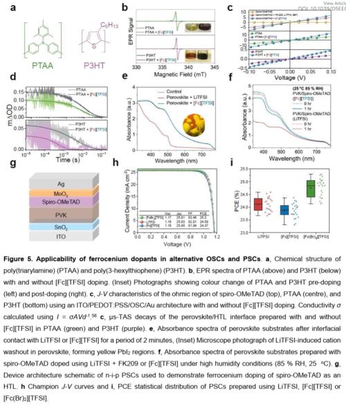 高效、无锂、空气稳定的钙钛矿太阳能电池使用优化的二茂铁盐(如[Fc(Br)₂][TFSI])完全替代传统吸湿、不稳定的LiTFSI和FK209共掺杂剂,制备的n-i-p结构钙钛矿太阳能电池实现了25.30%的最高效率(基准LiTFSI器件为24.59%),展现了卓越的性能替代潜力。