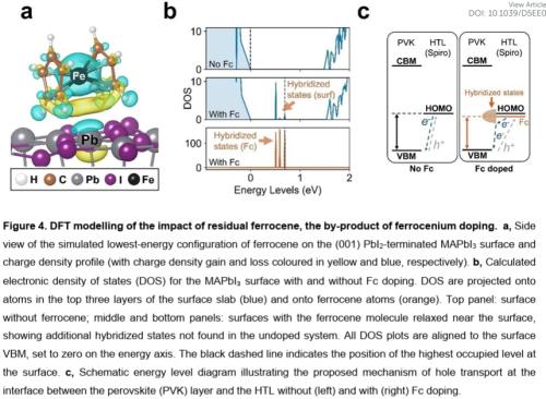 显著增强器件界面稳定性与空穴提取金属茂盐掺杂剂及其反应副产物中性二茂铁能有效钝化钙钛矿表面,诱导能带弯曲并形成表面杂化态,从而提升空穴提取效率(最高提升45%)。掺杂后的空穴传输层表现出优异的耐湿性(高湿度下性能衰减远低于LiTFSI),有助于提升器件整体环境稳定性。