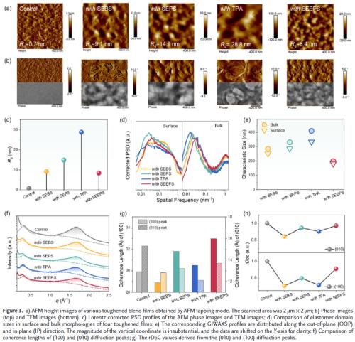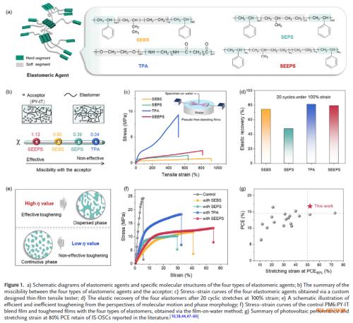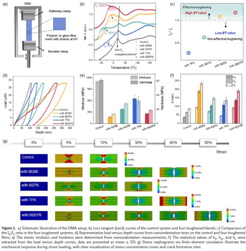 提出通用增韧策略与定量评估参数:首次引入弹性体SEEPS,并通过动态力学分析定义增韧参数η,建立了弹性体-受体相容性与机械增强效果的定量关系,为理性设计可拉伸OSC提供了新准则。