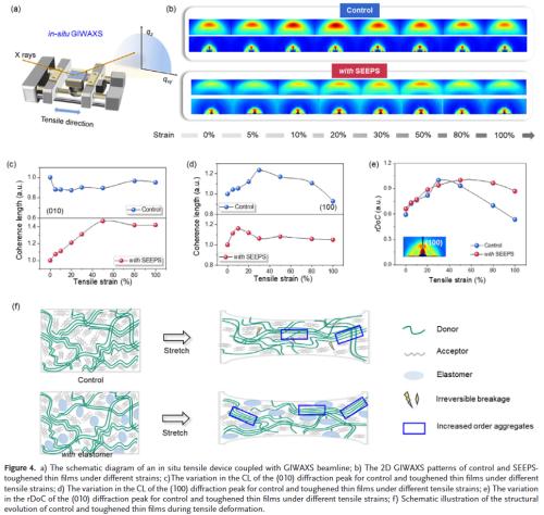 揭示应变下结构稳定机制:通过原位拉伸GIWAXS分析,阐明了SEEPS能够在应变下有效抑制晶格畸变与相分离,维持分子有序性,从而保障器件在动态形变下的光电性能与机械耐久性。