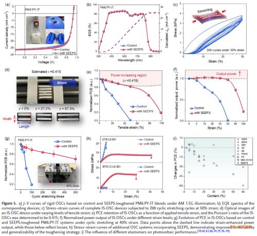 实现高效率与超高拉伸性的统一:SEEPS的引入在基本不影响光电性能的前提下,将薄膜断裂应变提升11倍以上,使本征可拉伸OSC在52%的极高应变下仍能保持80%的初始效率,为目前报道的最高水平之一。