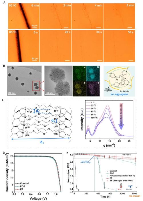 该研究成果以《离子聚集体介导的快速自修复聚合物实现可持续钙钛矿太阳能电池的有效封装》(A rapid self-healing polymer mediated by ion aggregates achieves effective encapsulation of sustainable perovskite solar cells)为题,发表在国际权威期刊《科学进展》(Science Advances)。西安交通大学前沿院助理教授王双洁为论文第一作者,西安交通大学前沿院王双洁、鲁广昊教授和西北工业大学材料学院李炫华教授为通讯作者。以上工作得到国家自然科学基金、陕西省科学技术创新项目、中国科学院战略性先导科技专项和中央高校基本科研业务费等项目的资助。表征以及测试工作得到西安交通大学分析测试中心的支持。