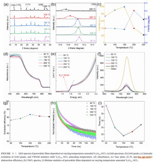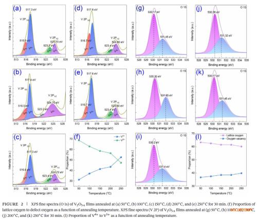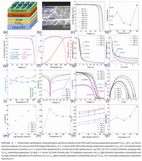 界面与缺陷协同优化:通过150°C退火调控V₂O₅₋ₓ中氧空位与V⁴⁺比例,优化能级匹配、降低界面陷阱密度,显著提升器件效率与稳定性。