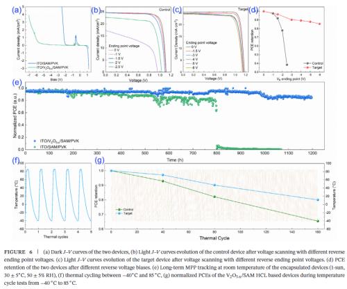 关键的是,V₂O₅₋ₓ将反向击穿电压从约|–2| V提升至|–6| V,赋予器件更高的反向偏压稳定性与阴影效应耐受性。这些结果表明,V₂O₅₋ₓ可同时提升PSCs的效率与稳定性,为实现高效、耐用的PSCs提供了有前景的路径。
