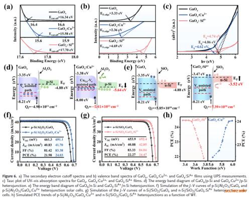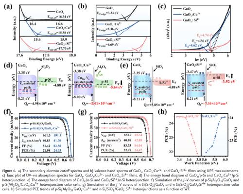 首次将超宽带隙GaOₓ用于硅电池钝化接触:揭示了GaOₓ通过离子掺杂(Cu²⁺, Si⁴⁺)调控氧空位浓度与功函数,实现从空穴选择性到电子选择性的“双极性”可调转变。