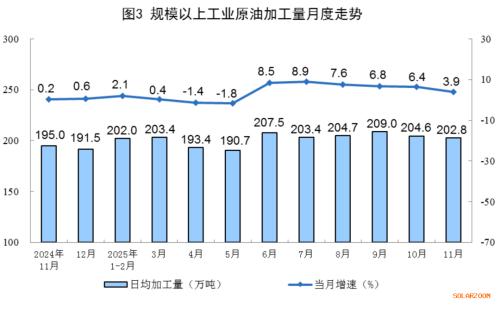 原油加工平稳增长。11月份,规上工业原油加工量6083万吨,同比增长3.9%;日均加工量202.8万吨。