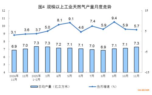 天然气生产稳定增长。11月份,规上工业天然气产量219亿立方米,同比增长5.7%;日均产量7.3亿立方米。