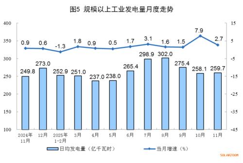 规上工业电力生产保持增长。11月份,规上工业发电量7792亿千瓦时,同比增长2.7%;日均发电量259.7亿千瓦时。1—11月份,规上工业发电量88567亿千瓦时,同比增长2.4%。