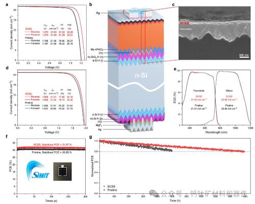 叠层电池采用钙钛矿器件和底部异质结(HJT)硅电池,实现了最大功率转换效率32.3%,认证效率为32.12%。