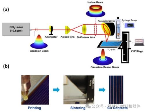 实验中,铜微米和纳米颗粒沉积厚度140微米、涂有ITO涂层的Czochralski(Cz)晶圆上,烧结则使用CO₂激光器进行。美国印刷电子制造商Novacentrix提供的商业铜浆料用于高分辨率打印。