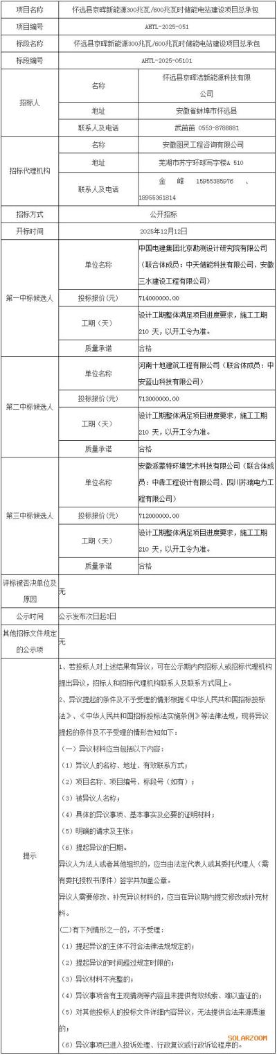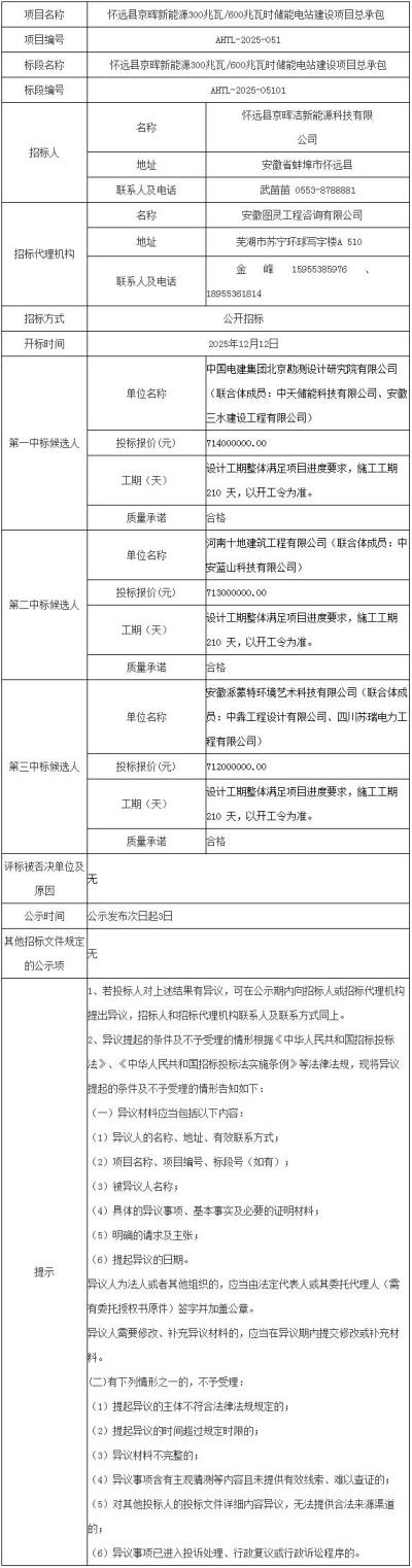 12月12日,怀远县京晖新能源300兆瓦/600兆瓦时储能电站建设项目总承包中标候选人公示。