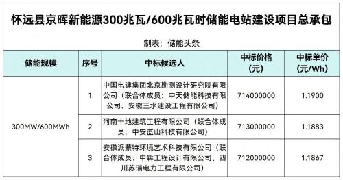 第一中标候选人为中国电建集团北京勘测设计研究院有限公司、中天储能科技有限公司、安徽三水建设工程有限公司联合体,投标报价为714000000元,折合单价1.19元/Wh;第二中标候选人为河南十地建筑工程有限公司、中安蓝山科技有限公司联合体,投标报价为713000000元,折合单价1.1883元/Wh;第三中标候选人为安徽派蒙特环境艺术科技有限公司、中犇工程设计有限公司、四川苏瑞电力工程有限公司联合体,投标报价为712000000元,折合单价1.1867元/Wh。
