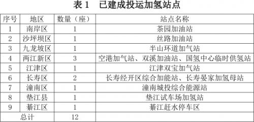 3.氢站网络雏形基本形成。目前,全市已建成并投入运营加氢站12座(具体情况见表1)。其中,9座为公共服务领域加氢站,3座为特殊用途供氢设施(不对车辆进行经营性加注,为供氢母站和试车用氢气),主要覆盖主城都市区等核心产业区及交通节点,总加注能力7500千克/日,初步形成加氢站点网络雏形,为氢燃料电池汽车的推广运行提供了基础保障。