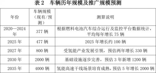 根据我市氢能应用场景分析及氢燃料电池车辆历年发展趋势,结合行业发展形势评估和分析,预测全市氢燃料电池汽车2027年有望达到800辆,2030年有望达到2000辆,2035年有望达到4000辆(具体情况见表2)。