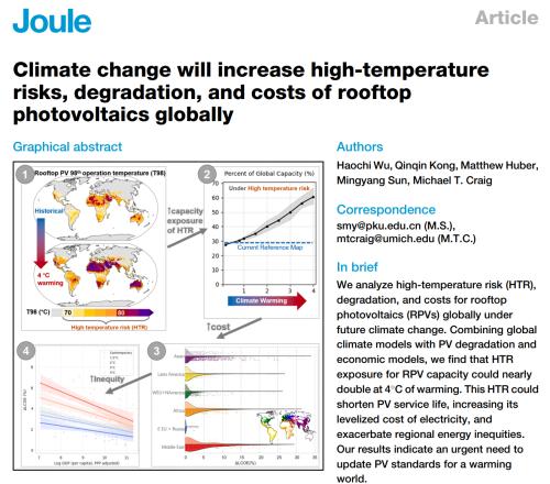 近日,北京大学先进制造与机器人学院孙铭阳研究员团队在能源领域顶级期刊《焦耳》(Joule)上发表题目为《气候变化将加剧全球屋顶光伏发电系统的高温风险、性能退化和成本上升》(“Climate change will increase high-temperature risks, degradation, and costs of rooftop photovoltaics globally”)的研究长文。