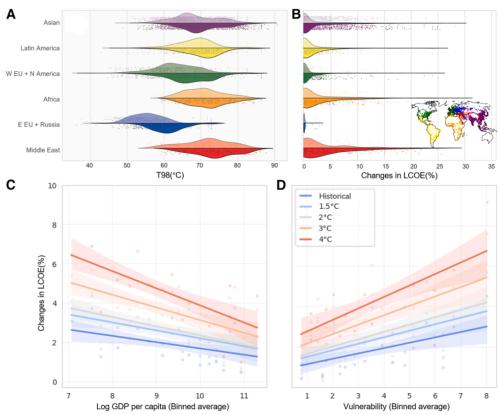 图2.高温风险与LCOE增长的区域差异。低GDP地区和气候脆弱地区面临更大幅度的成本上升,加剧了能源转型中的区域不平等